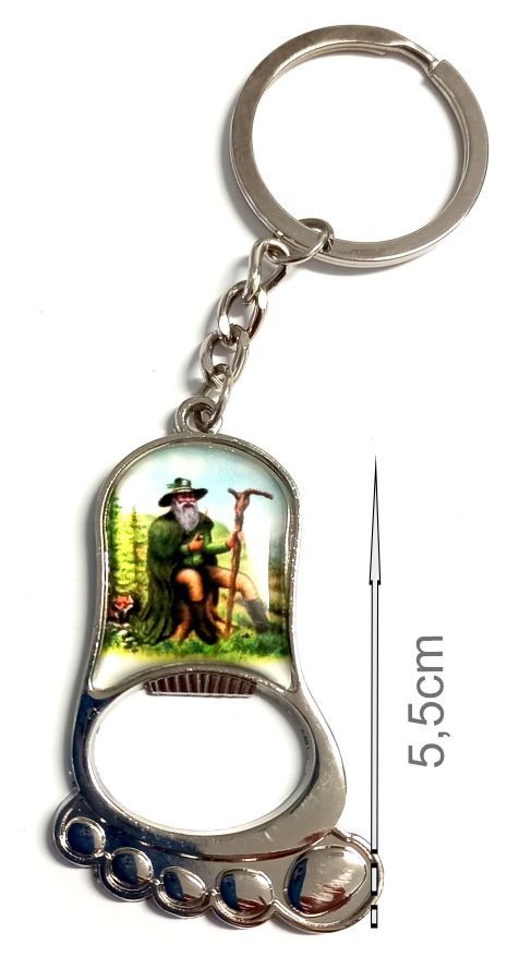 Klíčenka kovová s otvírákem a obrázkem Krakonoše pod akrylovou čočkou.