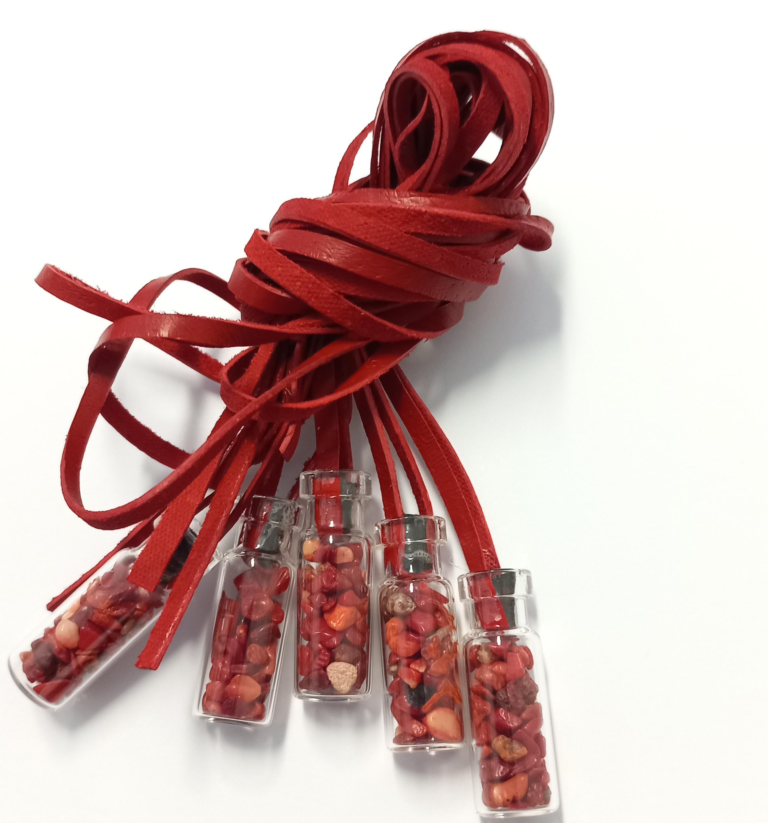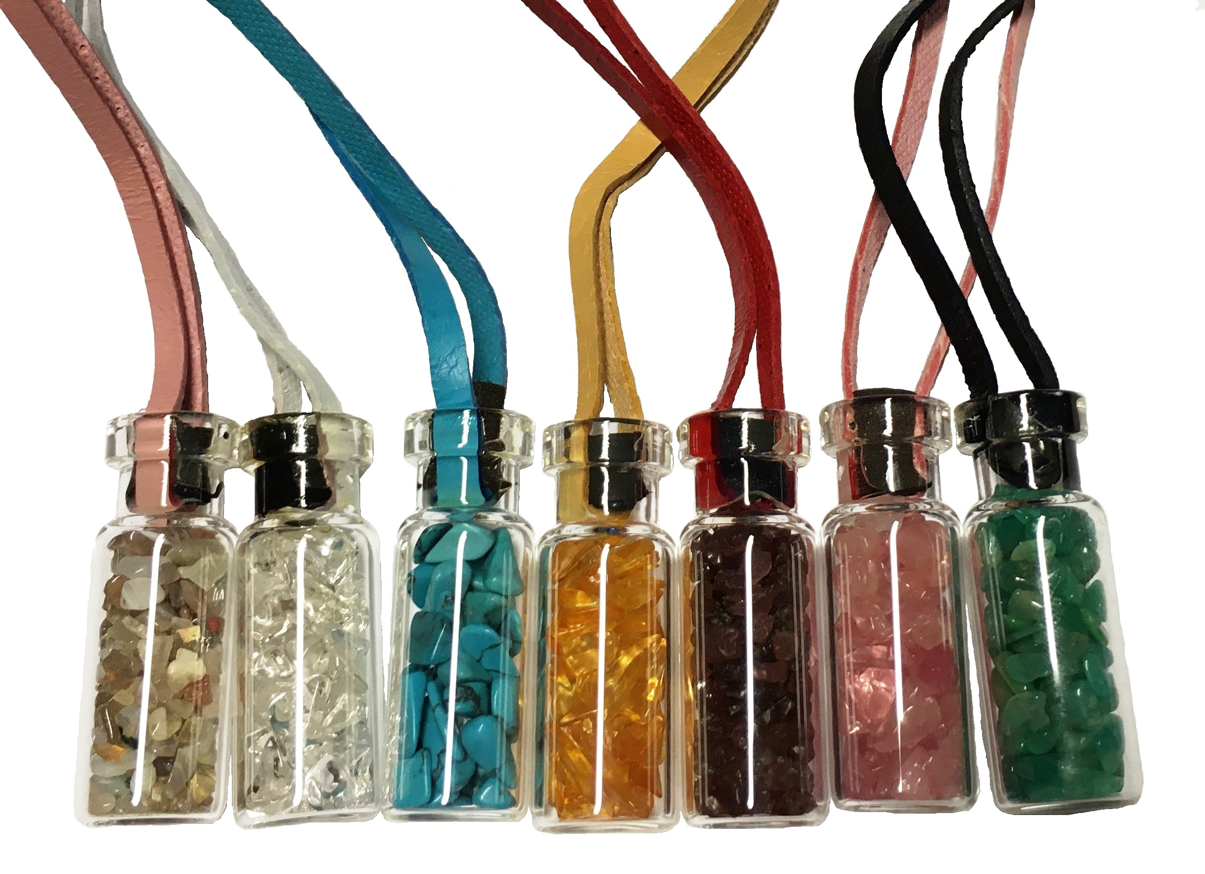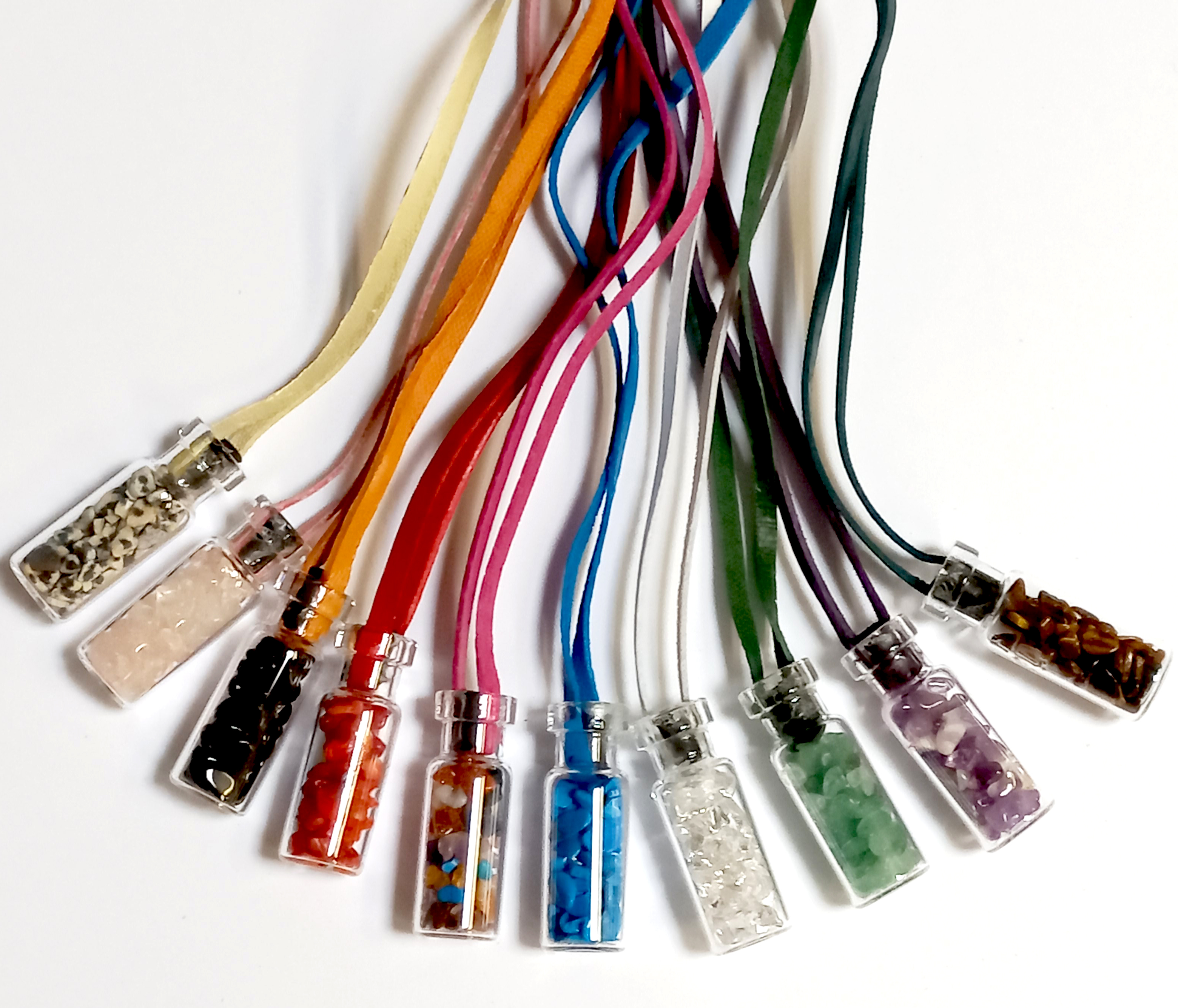 Krásně barevné minerály ve skleněné lahvičce. Navázáno na barevný kožený řemínek. Dodáváme v mixu 50 ks .