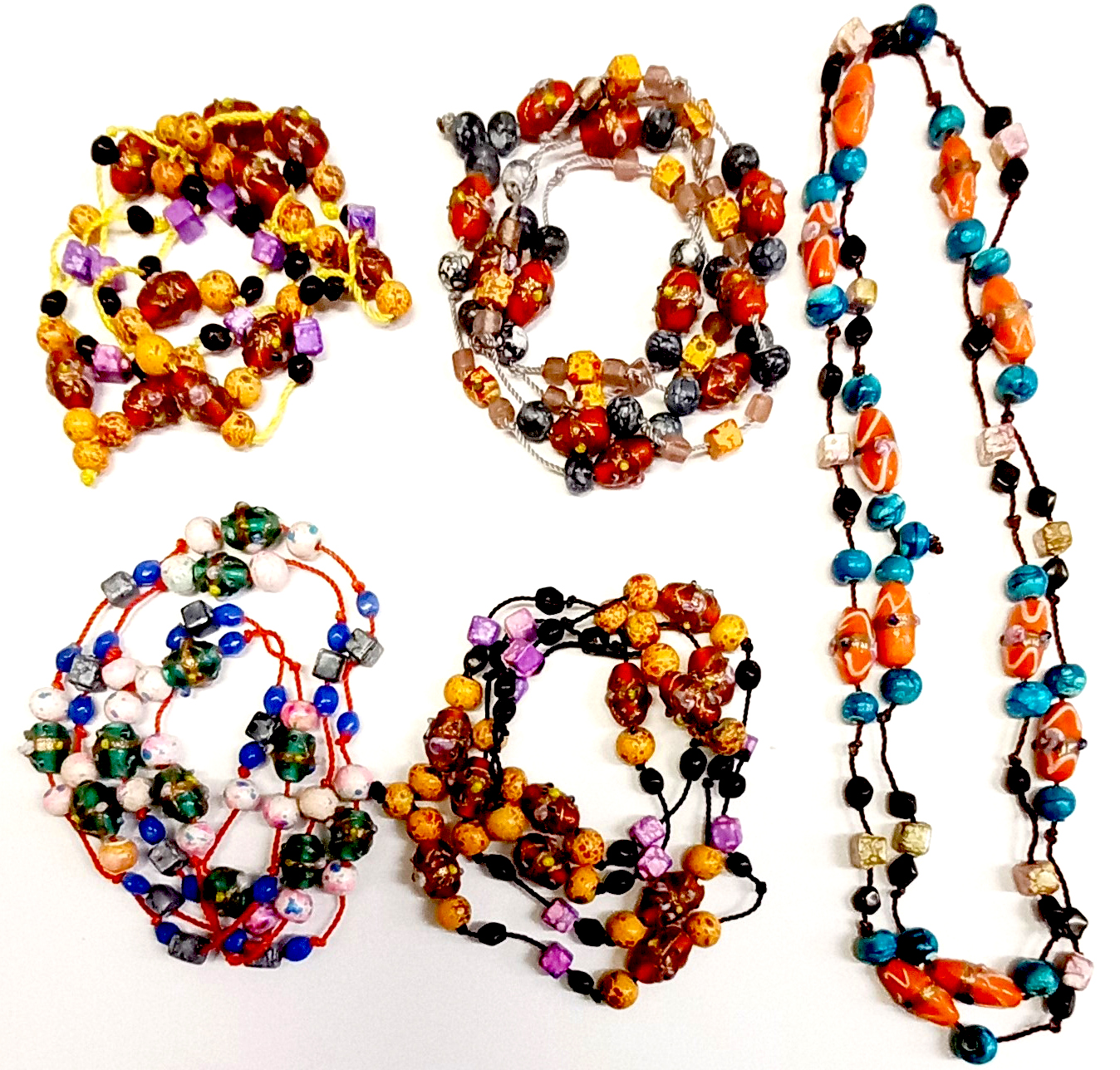 Náhrdelník bez uzávěru , korálky (i skleněné) navlečené na bavlněné šňůrce. Délka náhrdelníku 70cm, minimální odběr 5ks mix.