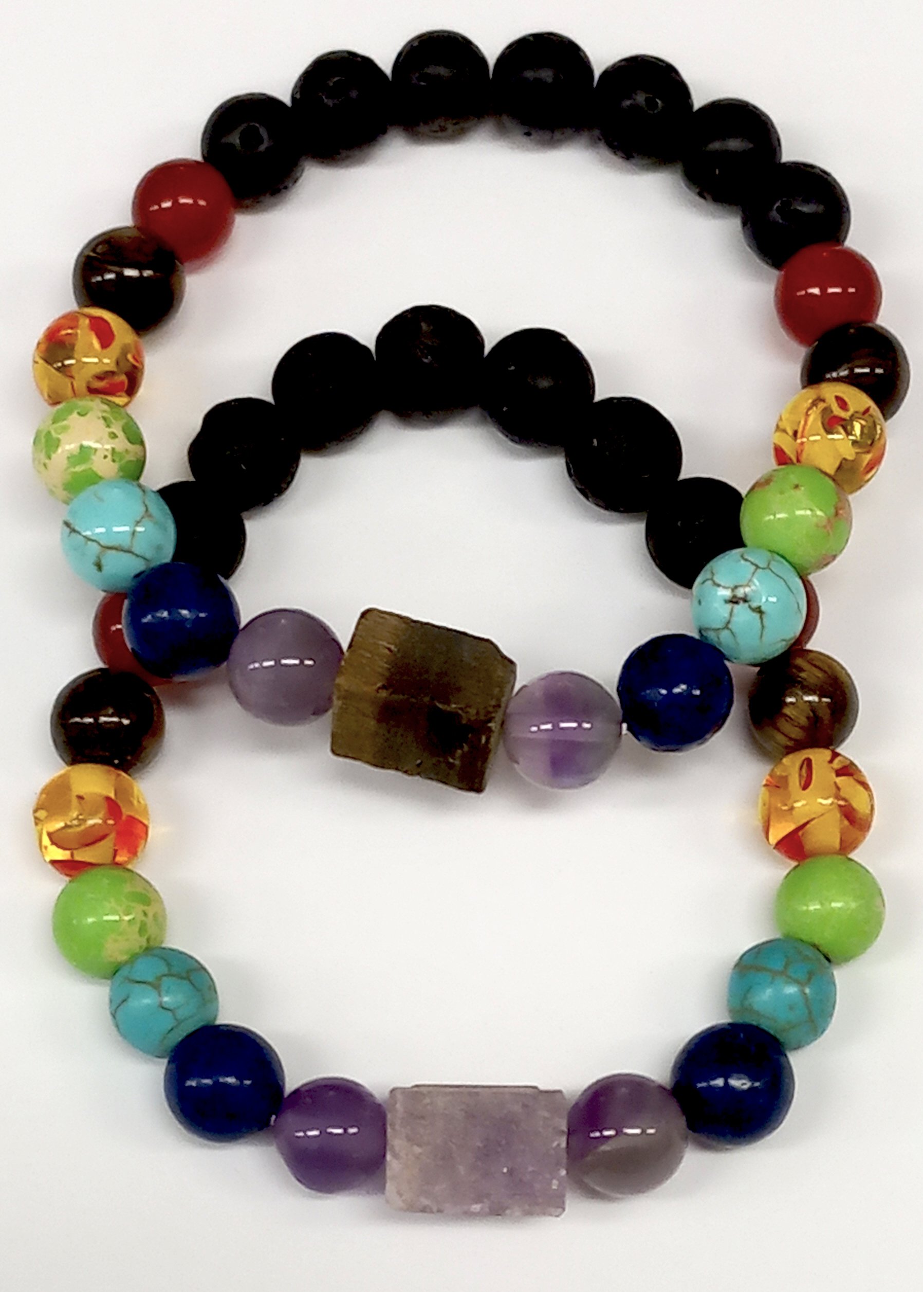 Náramek na gumičce, z přírodních minerálů a lávových kuliček s neleštěným  středovým kamenem.
