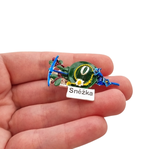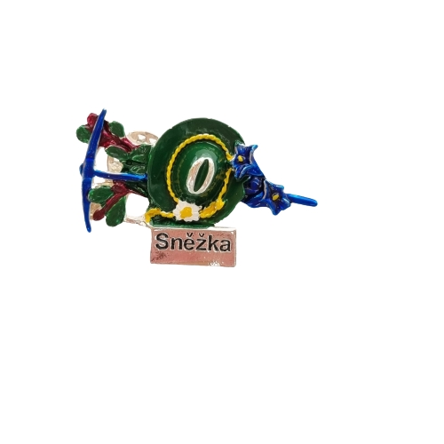 Cepín, klobouk s hořcem a protěží, nápis Sněžka.