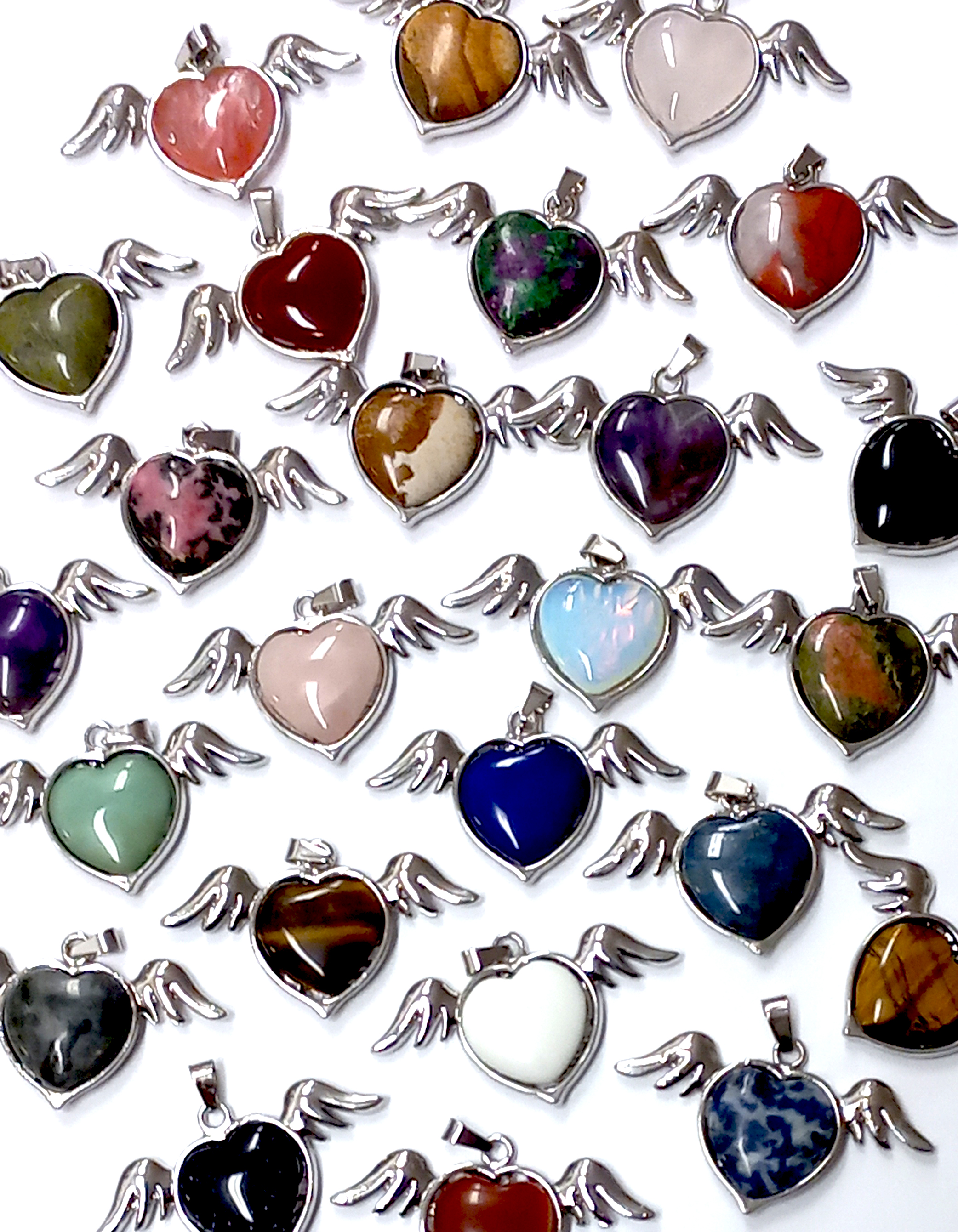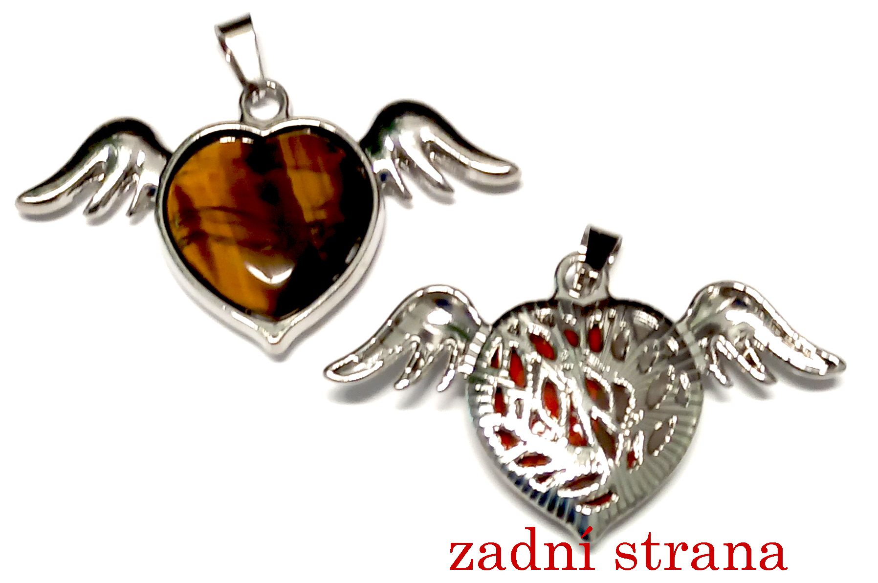 Minerály - srdíčka v kovovém závěsu ve tvaru křídel, 5x2,5cm.