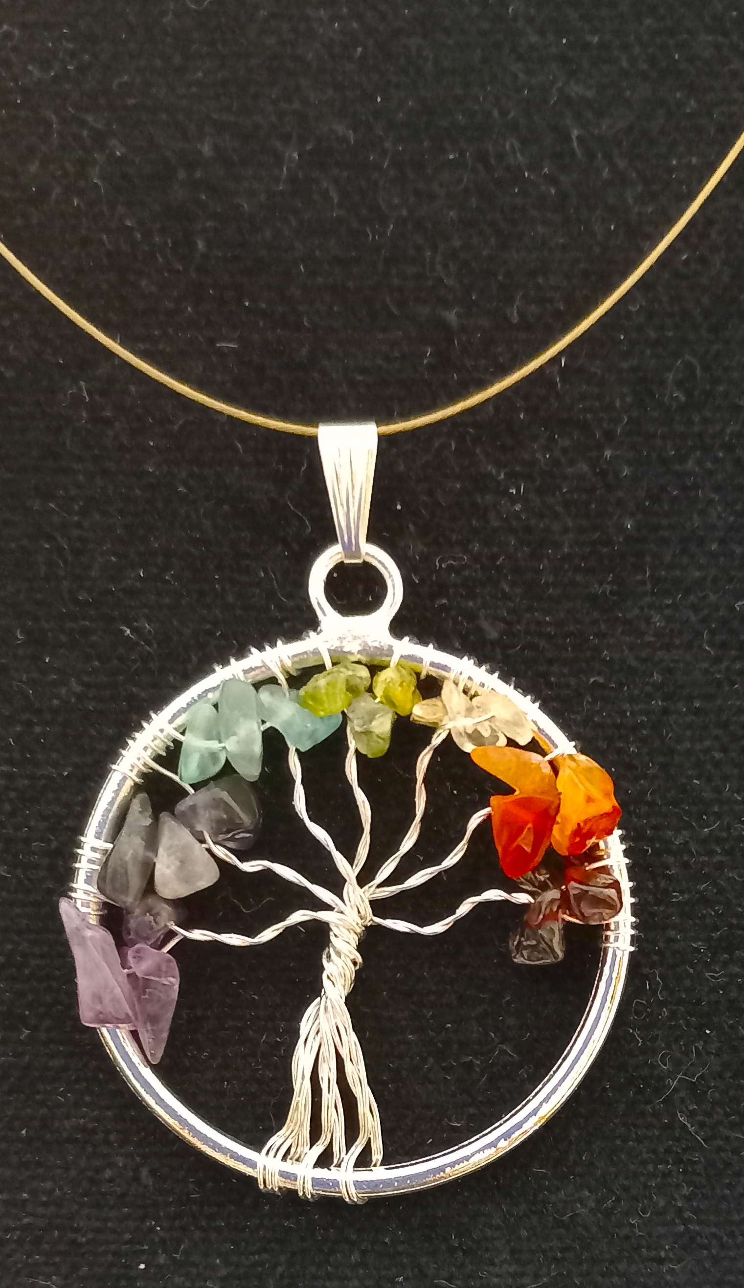 Kovový přívěsek s drobnými minerály na stromku připevněné v kovovém  kroužku , průměr 34mm. Samostatně zabaleno.