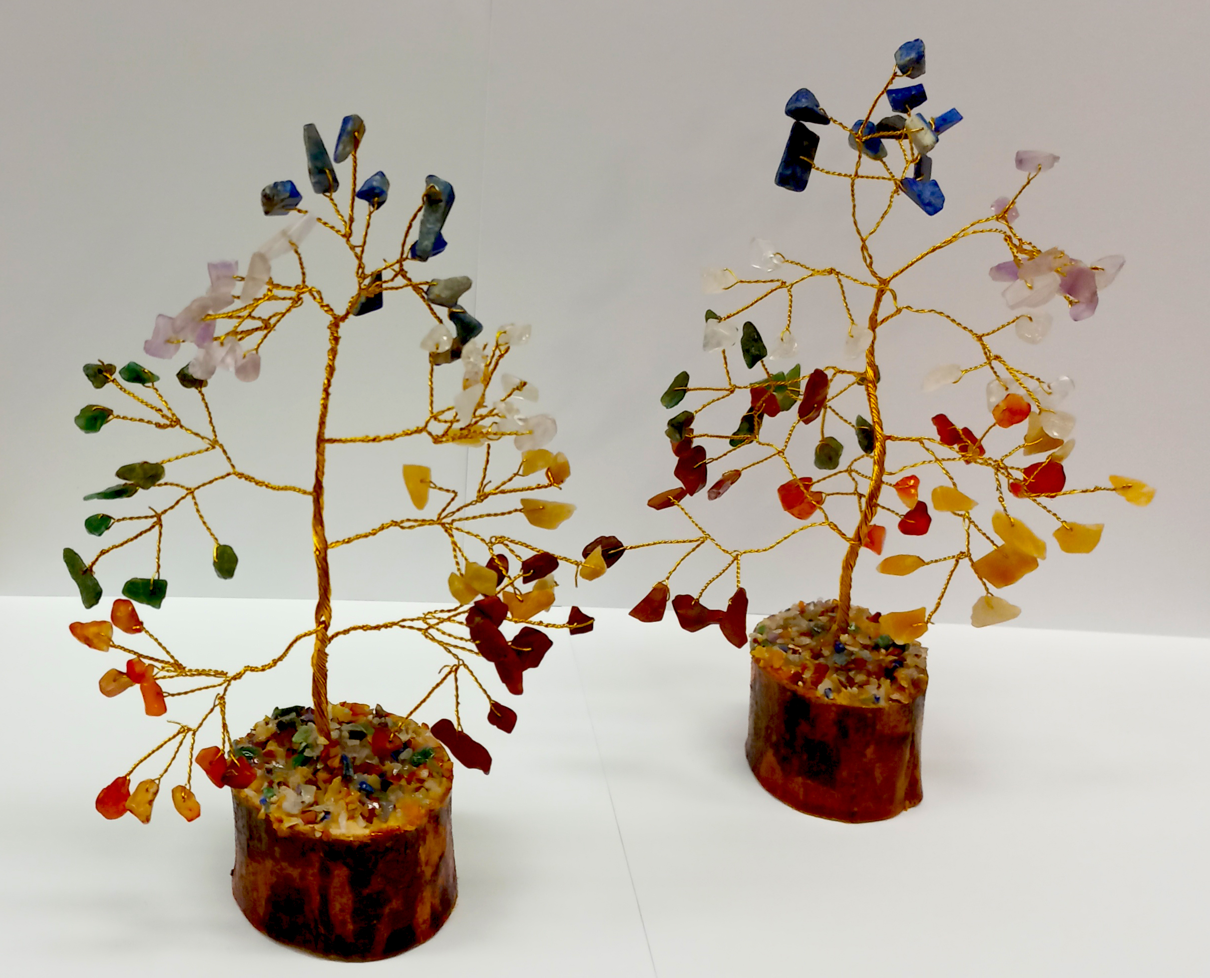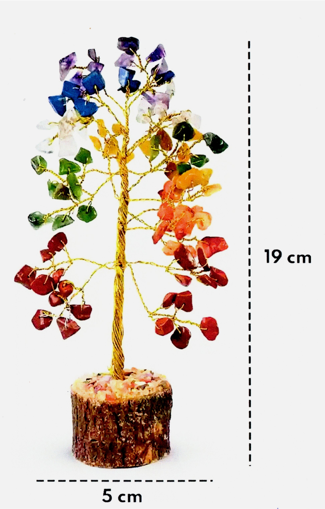 Strom života se sedmi druhy kamenů, zasazený do dřevěného kmene, který je pokrytý drobnými minerály. Výška cca 19cm.
