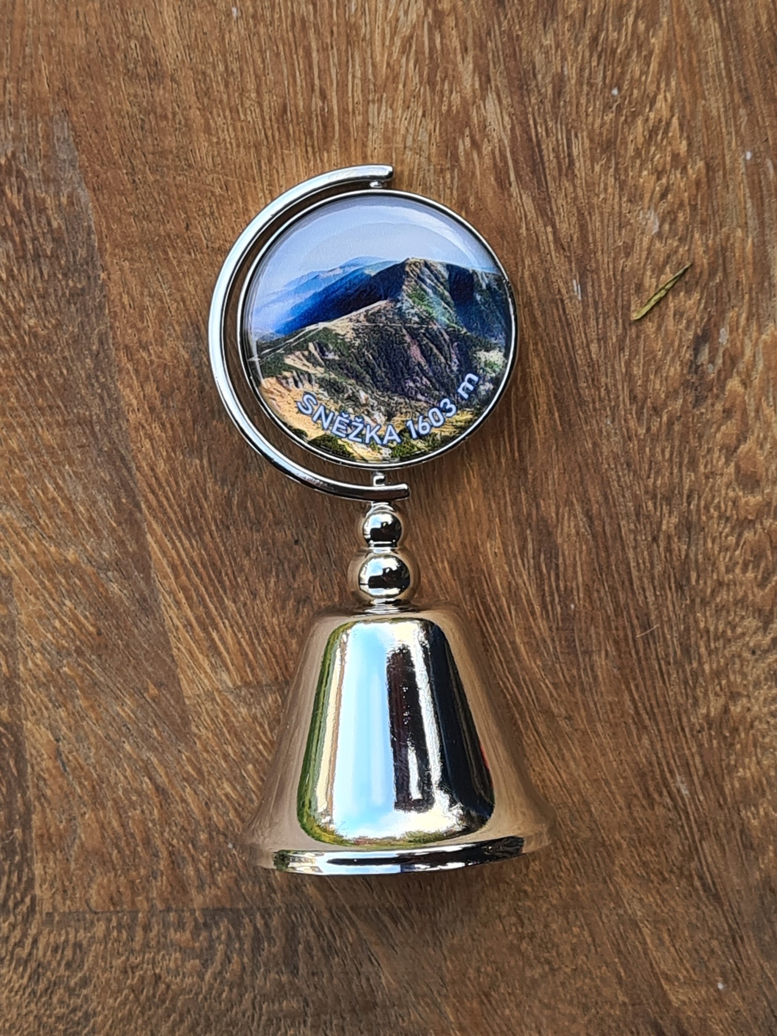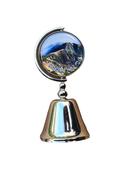 Zvoneček o výšce 10 cm má v horní části otočný motiv - letecký záběr na Sněžku a kresleného Krakonoše.