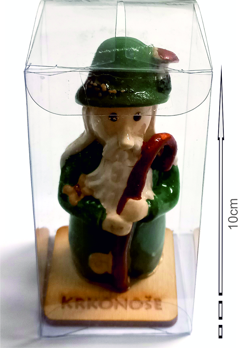 Keramická figurka Krakonoše stojící na dřevěné podložce s nápisem Krkonoše.