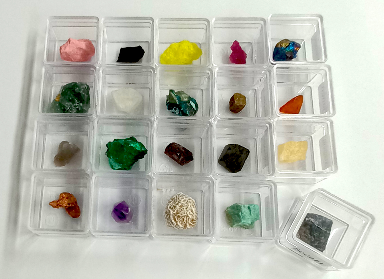 Surový minerál ve své skutečné podobě , v malé plastové krabičce. Každá krabička je opatřena názvem minerálu.